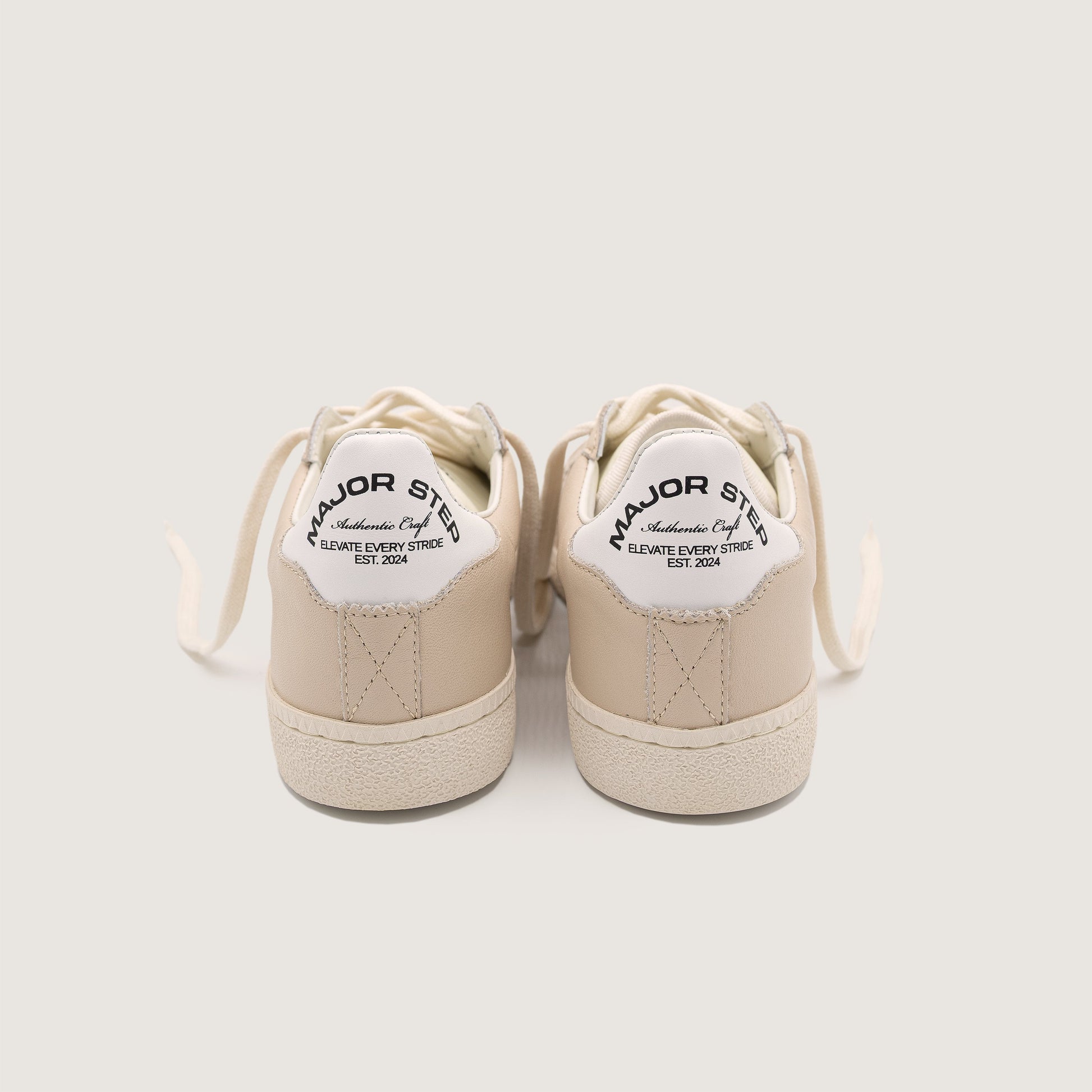 Jagged non è solo una sneaker: è un segno grafico, un’idea di movimento. Il design si costruisce per contrasti: linee frastagliate che interrompono la pulizia della silhouette, forature studiate come pattern di respiro, materiali solidi alleggeriti da una suola in gomma. La pelle bovina veste la scarpa di autenticità, mentre i loghi stampati e il banner laterale diventano elementi iconici.
